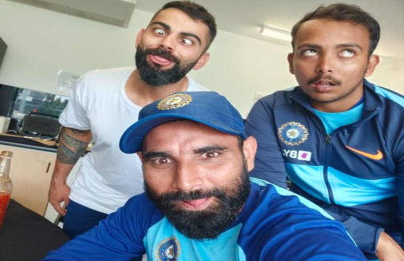 बता दें कि न्यूजीलैंड खिलाफ टी-20 सीरीज और वनडे सीरीज के बाद अब भारत 21 फरवरी से दो मैचों की टेस्ट सीरीज खेलेगा। इससे पहले न्यूजीलैंड इलेवन के खिलाफ भारत तीन दिवसीय प्रैक्टिस खेला है, जो ड्रॉ रहा है। इस मैच में मोहम्मद शमी ने शानदार प्रदर्शन करते हुए मात्र 10 ओवर की गेंदबाजी में 3 विकेट अपने नाम किए हैं। बता दें कि इस मैच में कप्तान विराट कोहली नहीं खेले थे। मैच के बाद विराट कोहली ने मोहम्मद शमी व पृथ्वी शाॅ के साथ खींची गई एक फोटो ट्विटर पर शेयर की है। इस फोटो में विराट और शमी व पृथ्वी ने अजीब ढंग से आंखों को टेड़ा किया हुआ है।