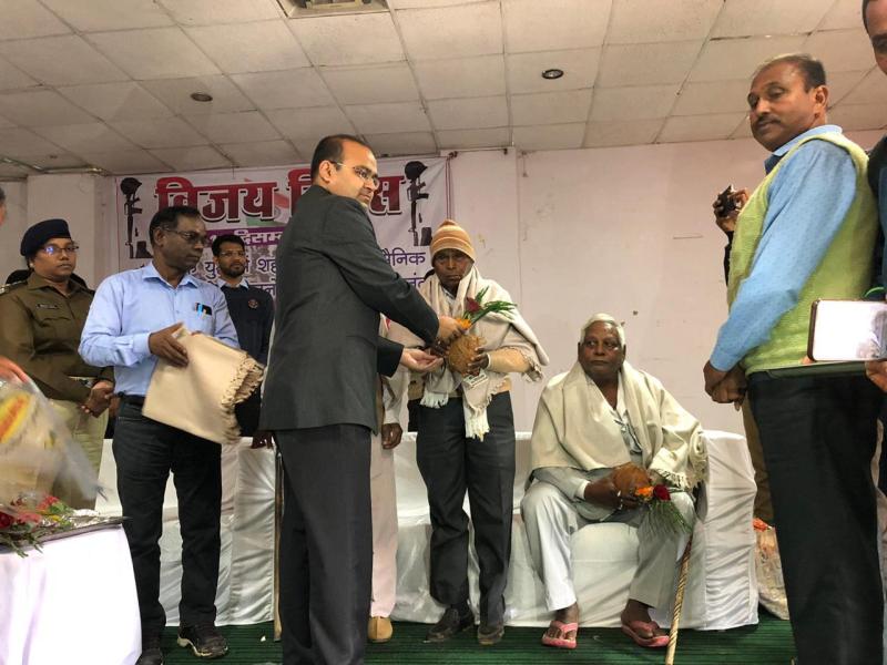 अनूपपुर। भारत पाकिस्तान युद्ध 1971 में भारत की विजय एवं वीरों की शहादत एवं शौर्य का जिला स्तरीय विजय दिवस समारोह १६ दिसम्बर को स्वसहायता भवन में आयोजित किया गया, जहांं वीर जवानों को याद कर नमन किया गया। साथ जवानों व परिजनों को जिला प्रशासन द्वारा सम्मान भी किया गया। समारोह की शुरुआत 1971 युद्ध वीरों एवं उनके परिवार जनो को गार्ड ऑफ ऑनर देकर हुई। इसके बाद भारत मां की सेवा में अपने प्राणो की आहुति देने वाले वीरों को श्रद्धांजलि दी गई। इस मौके पर कलेक्टर चंद्रमोहन ठाकुर द्वारा मुख्यमंत्री के संदेश का वाचन किया गया। जिसमें देश के विकास, खुशहाली एवं अमन चौन के लिए सक्रिय सकारात्मक भूमिका निभाने का प्रण लिया। कलेक्टर द्वारा 1971 युद्ध में जिले से शामिल गुरु प्रसाद केवट, मोहन सिंह धुर्वे, रामस्वरूप शर्मा एवं स्व. शीतल प्रसाद की धर्मपत्नी रामबाई को शॉल एवं श्रीफल प्रदान कर सम्मानित किया गया। ग्राम छिल्पा निवासी रामस्वरूप शर्मा तत्कालीन समय में 15 वीं कोर ऊधमपुर में, वार्ड नम्बर 11 अनूपपुर के निवासी गुरुप्रसाद केवट 14 वीं ब्रिगेड मिजोरम में पदस्थ थे, ब्रिगेड से स्व. शहीद लांस नायक ऐल्बर्ट एक्का को परमवीर चक्र एवं स्व. शहीद मेजर एके तारा को वीर चक्र प्रदान किया गया था। जबकि ग्राम दमगढ़ पुष्पराजगढ़ निवासी मोहन सिंह धुर्वे कलकत्ता में पदस्थ थे एवं स्व. शीतल प्रसाद ने युद्ध क्षेत्र में सक्रिय योगदान दिया था। जिला सैनिक कल्याण बोर्ड से प्राप्त जानकारी के अनुसार अमलाई के भागचंद, हर्राटोला के राम प्रताप जायसवाल, परसवार निवासी रामबिहारी सिंह, संजयनगर निवासी रामनरेश गिरी, बिजुरी के तुलसीराम प्रजापति, ग्राम खांड़ कोतमा के कृपाशंकर पांडे ने 1971 युद्ध में सहभागिता निभाई थी। वहीं भारत पाकिस्तान युद्ध 1971 पर आधारित डॉक्युमेंटरी फिल्म एवं फोटो प्रदर्शनी के माध्यम से तत्कालीन प्रधानमंत्री स्व. इंदिरा गांधी के दृढ़ संकल्पित राजनैतिक नेतृत्व एवं सैन्य बल के शौर्य से अवगत हुए। स्कूली छात्र छात्राओं द्वारा सांस्कृतिक प्रस्तुति दी गई। इससे पूर्व जिला मुख्यालय में विजय दौड़ का आयोजन किया गया, दौड़ इंदिरा तिराहे से सुबह 8 बजे प्रारम्भ हुई एवं शासकीय तुलसी कॉलेज में समापन हुआ।