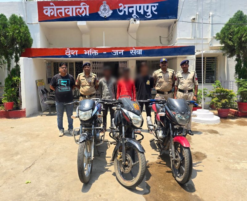 थाना कोतवाली अनूपपुर पुलिस ने मध्यप्रदेश एवं छत्तीसगढ़ राज्य में सक्रिय अंतरर्राज्यीय बाइक चोर गिरोह का पर्दाफाश करते हुए तीन आरोपियों को गिरफ्तार कर चोरी की तीन बात को जब्त किया है। पुलिस अधीक्षक अनूपपुर मोती उर रहमान के निर्देशन एवं अतिरिक्त पुलिस अधीक्षक इसरार मंसूरी तथा एसडीओपी अनूपपुर सुमित केरकेट्टा के मार्गदर्शन में कार्रवाई की गई। टीआई कोतवाली निरीक्षक अरविन्द जैन के नेतृत्व में प्रधान आरक्षक शेख रसीद, प्रधान आरक्षक रीतेश सिहं, आरक्षक अब्दुल कलीम की टीम ने राजा वासूदेव पिता कमलेश वासुदेव उम्र करीब 25 साल निवासी ग्राम केल्हौरी थाना चचाई अनूपपुर को सोमवार की दोपहर चोरी की काले रंग की बिना नम्बर प्लेट की बाइक ले जाते हुए पकड़ा गया। पूछताछ में उसने थाना जैतहरी के खूंटाटोला से बाइक चोरी करना स्वीकार किया। पुलिस को जांच में जानकारी मिली कि युवक से जब्त की गई बाइक संतोष कुमार पड़वार पिता मोतीलाल पड़वार निवासी ग्राम पपरौड़ी थाना जैतहरी की है, जो 3 मार्च को खूंटाटोला थाना जैतहरी से चोरी हुई थी। इसके बाद आरोपी से पुलिस ने कड़ाई से पूछताछ की तो उसने दो अन्य बाइकों की चोरी का खुलासा किया। कोतवाली पुलिस ने तत्काल कार्रवाई करते हुए वेदप्रकाश राठौर पिता राजन प्रसाद राठौर उम्र 24 साल निवासी पुरानी बस्ती पेण्ड्रा थाना जीपीएम छग को गिरफ्तार कर उसके पास से एक बाइक जब्त की। पुलिस ने बताया कि 6 मार्च को बाइक इस बाइक की चोरी की शिकायत गणेश सिंहं निवासी ग्राम धुरवासिन थाना भालूमाड़ा ने की थी। इसी तरह कोतवाली पुलिस ने जैलेश माली पिता कमलेश माली उम्र 22 साल निवासी पुरानी बस्ती पेण्ड्रा थाना छत्तीसगढ़ को चोरी की एक बाइक के साथ गिरफ्तार किया। आरोपी ने गौरेला से बाइक चोरी करना स्वीकार किया। पुलिस ने मप्र एवं छग राज्यों के सरहदी जिलों में सक्रिय वाहन चोरों को गिरफ्तार कर न्यायालय से पुलिस रिमाण्ड में लेकर अन्य बाइक चोरी के संबंध में पूछताछ कर रही है। आरोपी छत्तीसगढ से बाइक चोरी कर जिला अनूपपुर में सस्ते दामों पर बेचते थे।