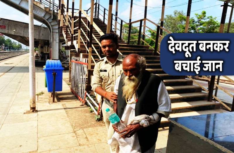 गिरते ही बुजुर्ग ट्रेन और प्लेटफॉर्म के बीच की आधा फिट खाली जगह में फंस गया तो वह ट्रेन में गेट के पास लगे पाइप को पकड़कर लटक गया। प्लेटफॉर्म पर मौजूद जीआरपी जवान दिनेशकुमार व रविसिंह की नजर पड़ी तो उन्होंने दौड़कर उसे बाहर खींचा। इससे वह सुरक्षित बच गया।