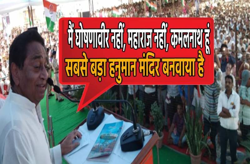 - कमलनाथ बोले मैं महाराजा नहीं और कोई मेरा गुलाम नहीं है, मैं मामा नहीं हूं और जेब में नारियल नहीं रखता, घोषणाएं नहीं करता और झूठ नहीं बोलता और न ही चाय बेचता हूं। कमलनाथ हूं छिंदवाड़ा में सबसे बड़ा हनुमान मंदिर बनाया है।