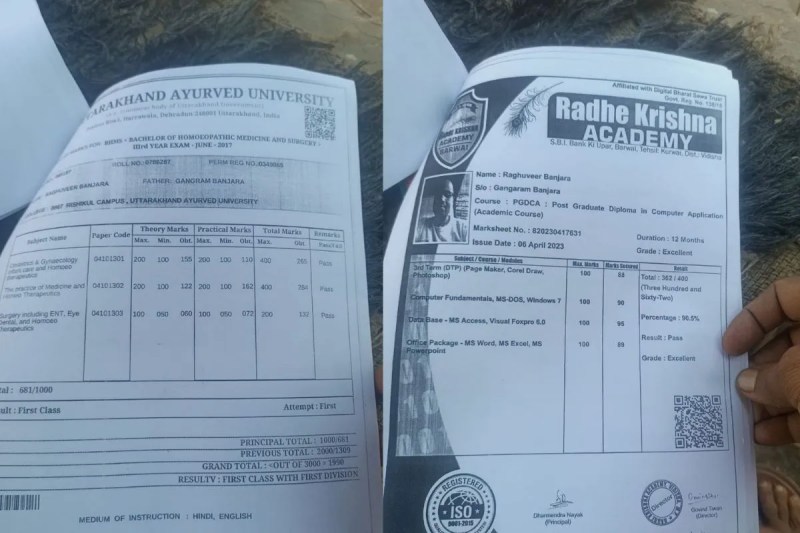 जब धर्मेंद्र नायक ने रघुवीर बंजारा को डिग्री और डिप्लोमा दिए तो उसे देखकर युवक के होश उड़ गए। जिसकी मुलाकात जनवरी 2023 में हुई थी, लेकिन धर्मेंद्र नायक ने रघुवीर बंजारा के नाम की उत्तराखंड आयुर्वेद यूनिवर्सिटी के नाम की बीएचएमएस की वर्ष 2015, 2016, 2017 और 2018 की अंकसूची, राधे कृष्णा कंप्यूटर ट्रेनिंग सेंटर की पीजीडीसीए की वर्ष 2023 का डिप्लोमा थमा दिया। साथ ही रघुवीर की पत्नी बुद्धा बंजारा के नाम की वीर बहादुरसिंह पूर्वांचल विश्वविद्यालय जौनपुर उप्र की एएनएम डिप्लोमा की वर्ष 2020 और वर्ष 2021 की अंकसूची पकड़ा दी।