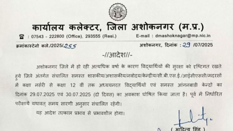अशोकनगर में भारी बारिश के कारण छात्रों की सुरक्षा को देखते हुए 29 और 30 जुलाई की छुट्टी घोषित कर दी गई है। कलेक्टर आदित्य सिंह ने इसके आदेश जारी किए हैं। जारी आदेशानुसार, जिले में संचालित सभी सरकारी और प्राइवेट स्कूलों में अवकाश रहेगा। इसमें नवोदय, केंद्रीय विद्यालय, सीबीएसई, आईसीएससी बोर्ड के स्कूल और मदरसे शामिल हैं। नर्सरी से लेकर 12वीं तक के सभी विद्यार्थियों के लिए आदेश तत्काल प्रभाव से लागू रहेगा।