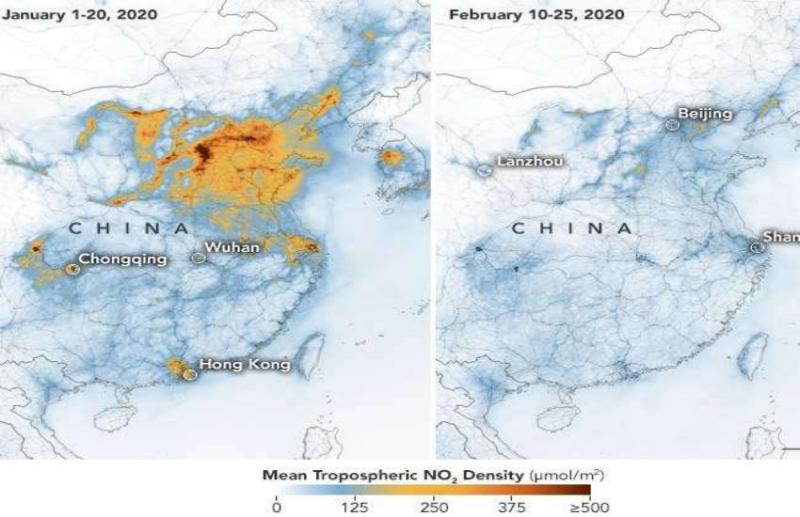 NASA और ESA के प्रदूषण निगरानी उपग्रहों ने चीन में वायु प्रदूषण के स्तर में यह गिरावट दर्ज की है। एजेंसी ने बीते महीने में नाइट्रोजन डाइऑक्साइड ( Nitrogen Dioxide ) के गिरते स्तर को दिखाया है। इसके लि कोरोना वायरस स को वजह माना जा रहा है। नासा ने शनिवार को एक बयान में कहा कि कोरोना वायरस की वजह से चीन में आर्थिक मंदी बढ़ी है। इसके कारण कई फैक्ट्रियां बंद हो गई, जिसके बाद प्रदूषण स्तर में गिरावट देखने को मिली है।