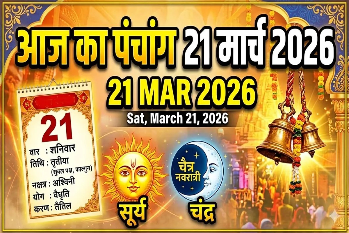 Aaj Ka Panchang 21 March 2026 : आज का पंचांग 21 मार्च 2026, शनिवार एक विशेष और शुभ दिन लेकर आया है, आज का दिन बेहद खास है जिसमें धार्मिक, ज्योतिषीय और सांस्कृतिक दृष्टि से कई महत्वपूर्ण योग बन रहे हैं। आज तृतिया तिथि, अश्विनी से भरणी नक्षत्र का संयोग, ऐन्द्र योग तथा रवियोग जैसे शुभ संयोग बन रहे हैं, जो नए कार्यों की शुरुआत के लिए अनुकूल माने जाते हैं।