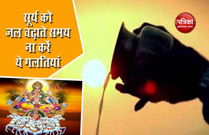 - ध्यान रखें जल चढ़ाते समय जमीन पर गिरा हुआ आपके पैरों तक नहीं पहुंचना चाहिए। किसी ऐसी जगह से सूर्य को जल चढ़ाएं, जहां से सूर्य को अर्पित किया गया किसी के पैरों में न आए।