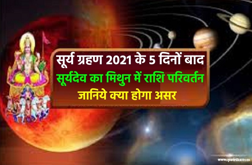 जानकारो के अनुसार बुध के वृषभ राशि में Gochar के बाद अब ग्रहों के राजा सूर्यदेव एक बार फिर परिवर्तन करते हुए मंगलवार,15 जून 2021 को सुबह 5:49 बजे वृषभ राशि से मिथुन राशि में प्रवेश कर जाएंगे। वे यहां शुक्रवार 16 जुलाई 2021 को शाम 4:41 बजे तक इसी स्थित रहेंगे।