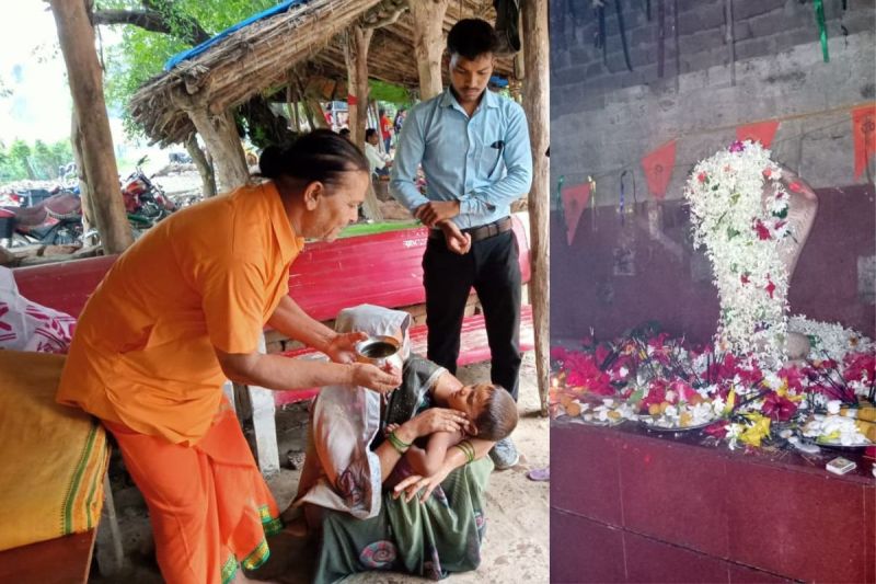 सर्पदंश से पीड़ित बच्चे का इलाज करते पुजारी।