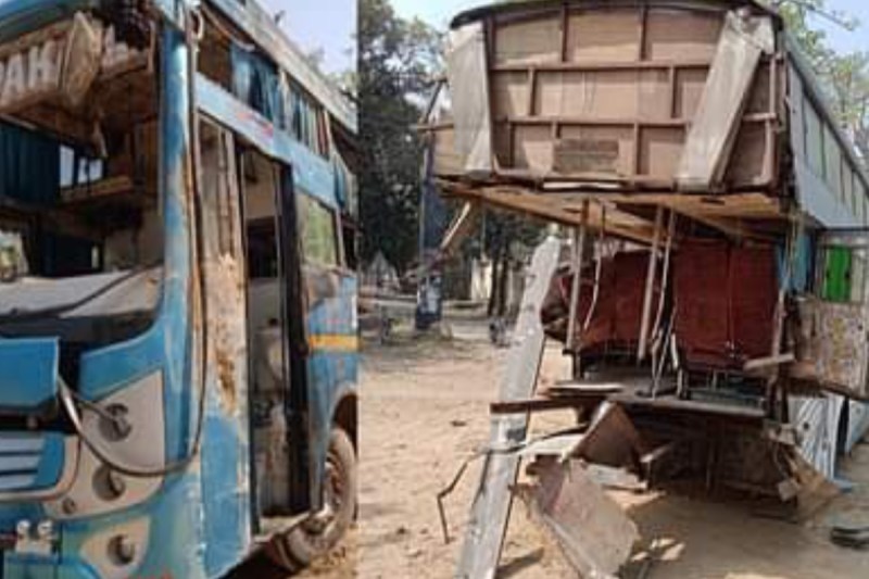 दुर्घटना के बाद क्षतिग्रस्त बस NH-27 पर हुआ हादसा