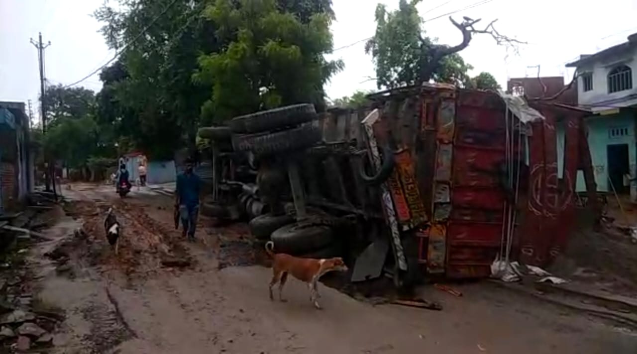 यह तस्वीर है अयोध्या शहर के नियांवा 9 Niyanava ) से यमथरा घाट ( Yamthara Ghat ) मार्ग की ,जहां पर मुख्य सड़क मार्ग के निर्माण में इस कदर भ्रष्टाचार किया गया सड़क इतनी कमजोर रही कि एक बालू से भरी ट्रक अचानक सड़क धंसने के कारण पलट गई . राहत की बात यही रही कि जिस जगह पर ट्रक पलटी उस जगह पर मौके पर कोई व्यक्ति मौजूद नहीं था , वरना एक बड़ा हादसा हो सकता था . जिस स्थान पर यह हादसा हुआ वह रिहायशी इलाका है और सड़क के दोनों ओर लोगों को के मकान है .