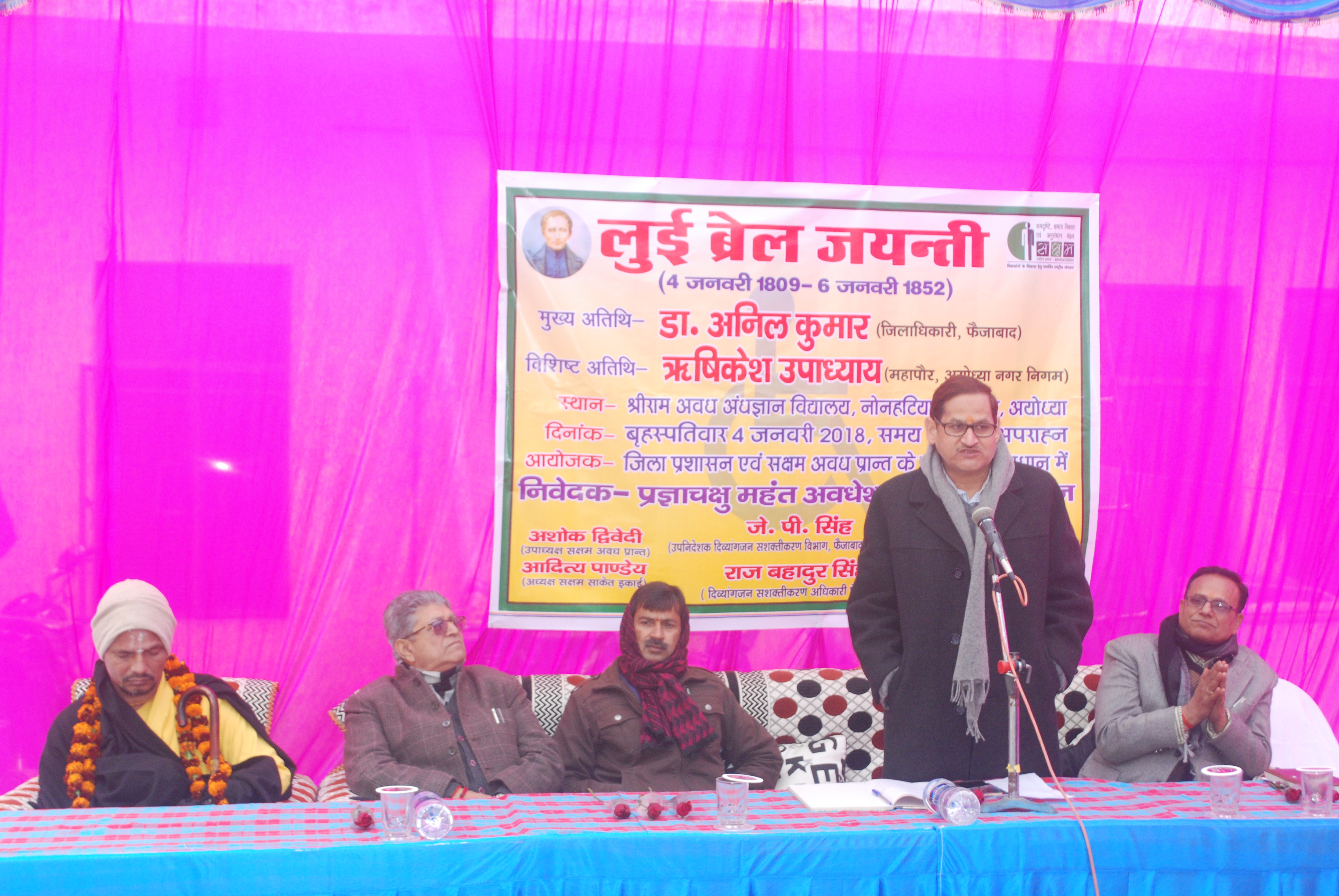 नेत्रहीन छात्रों को BRAIL लिपिके द्वारा पढ़ाया जाता है, इस लिपि में नेत्रहीन बच्चे अपने हाथों की मदद से अक्षरों का ज्ञान करते है। किताबों पर यह अक्षर छोटे छोटे छेदों के माध्यम से पढ़ते है। यह BRL लिपि की खोज फ़्रांस के रहने वाले लुई ब्रेल नमक व्यक्ति ने की थी। तबसे इस लिपि के माध्यम से नेत्रहीन बच्चो की पढाई होती है। 4 जनवरी 1809 में इस लिपि की खोज करने वाले लुई ब्रेल का जन्म हुआ था। जिसको लेकर आज अयोध्या के इस विद्यालय में BRAIL लिपि के स्थापना दिवस के रूप में मनाया गया। इस स्थापना दिवस पर इस विद्यालय में रह रहे बच्चों को कम्बल दिया गया। इस मौके पर मुख्या अतिथि के रूप में पहुंचे अयोध्या विधायक वेद गुप्ता ने बताया कि धर्म नगरी अयोध्या में यह चल रहे विद्यालय को और अधिक विकसित रूप दिया जायेगा। यह विद्यालय उन बच्चों को सहारा देने का कार्य कर रहा है, जो समाज से काफी उपेक्षित होते है, और यह बच्चे भी समाज को एक नई दिशा देने का कार्य करंगे। हम इन बच्चों के व्यवस्था के लिए तथा उनके इस ज्ञान को और बढ़ने के लिए प्रदेश सरकार से मदद मांगेंगे ताकि ऐसे बच्चों का भविष्य और उज्जवल हो सके। इस कार्यक्रम में आये अयोध्या के नव निर्वाचित मेयर ऋषिकेश उपाध्याय ने पढ़ रहे बच्चों की सुविधा के और संसाधन उपलब्ध करने को कहते हुये विद्यालय ने बच्चों के रहने के लिए एक नए कमरे के निर्माण कराने की बात रखी। फैजाबाद के जिला अधिकारी अनिल कुमार ने उपस्थित बच्चों को कम्बल दिया तथा विद्यालय के विकास के लिए तथा और नयी किताबों के लिए जल्द उचित प्रबन्ध करने को लेकर विद्यालय प्रबंधन को सहनभूति दिया। उन्होंने कहा कि इस विद्यालय के लिए और जो भी कार्य संभव होगा वह किया जायेगा मानव जीवन में परोकर से बढ़ कर कोई चीज नहीं होती है। इस कार्यक्रम के दौरान मौके पर जन विकलांग अधिकारी राज बहादुर सिंह , अभिषेक मिश्र , शंकर दास , महंत मनमोहन दास , अवधेश दास , आदित्य पाण्डेय , अवधेश दिवेदी भी मौजूद रहें।