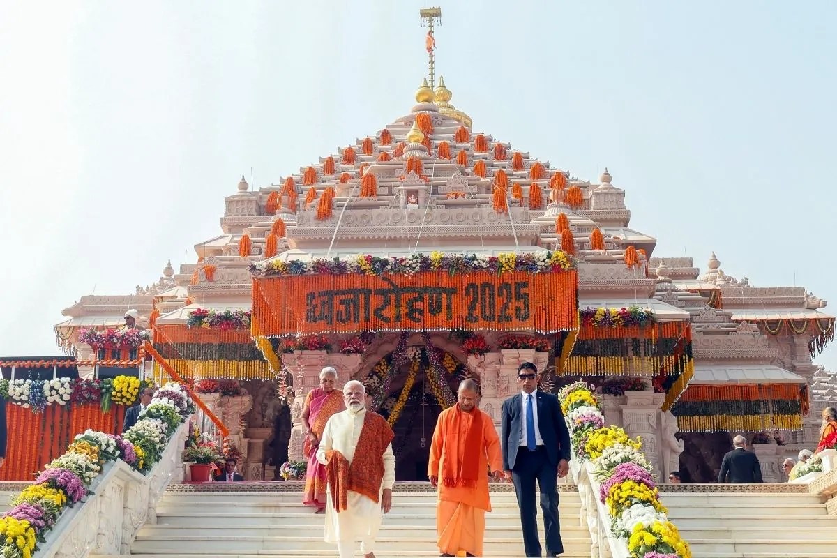 PM Modi Ayodhya flag Hoisting : श्रीराम मंदिर के शिखर पर PM मोदी और RSS प्रमुख मोहन भागवत ने ध्वजारोहण किया। रामलला की प्राण-प्रतिष्ठा के ठीक 673 दिन बाद आज प्रधानमंत्री नरेंद्र मोदी ने राम मंदिर के मुख्य शिखर पर धर्म ध्वजा फहराई। पीएम के बटन दबाते ही 161 फीट ऊंचे शिखर पर 2 किलो वजनी विशाल केसरिया ध्वज लहराने लगी। इस पल पीएम भाव-विभोर हो गए। प्रधानमंत्री ने धर्म ध्वजा को हाथ जोड़कर प्रणाम किया। धर्म ध्वजा फहराने के बाद पीएम ने संबोधन दिया।