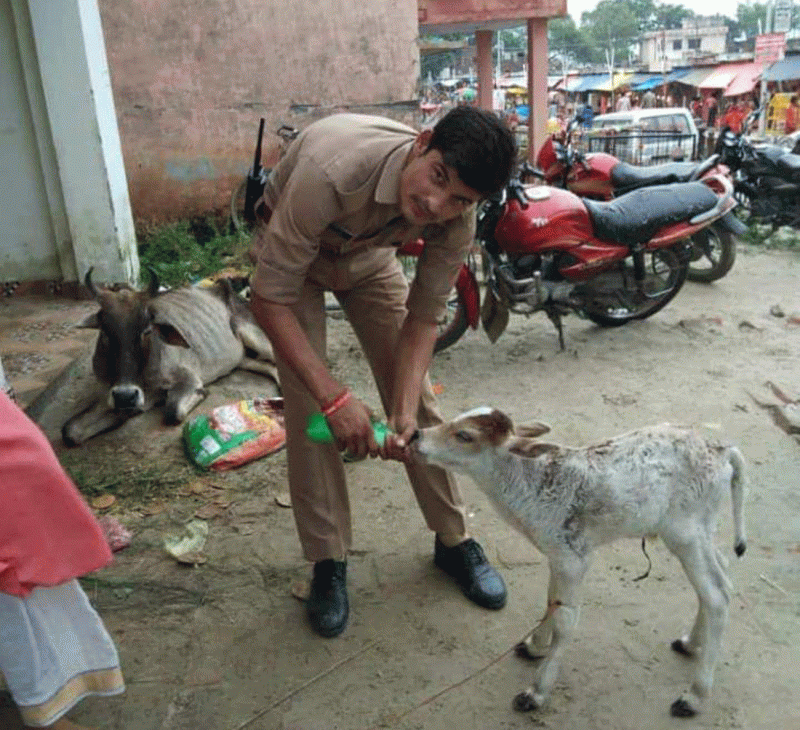 Ayodhya : भूख से बिलख रहा था नवजात बछड़ा पुलिसकर्मी ने बोतल से दूध पिलाकर बचाई जान