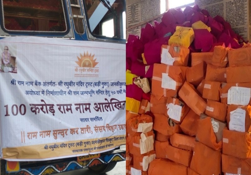 अयोध्या : राम मंदिर निर्माण के लिए जहां देश विदेश के राम भक्त मंदिर निर्माण में आर्थिक सहयोग दे रहे हैं तो वही देश विदेश से भव्य मंदिर निर्माण की इच्छा जता रहे राम भक्त हर दिन राम नाम का जप लिख कर अयोध्या भेज रहे हैं। इसी कड़ी में आज देश के राम भक्तों द्वारा लिखी गई 100 करोड़ राम नाम आलेखित पुस्तिका चित्रकूट के रघुवीर मंदिर ट्रस्ट के माध्यम से अयोध्या पहुंची जहां उन्हें अंतर्राष्ट्रीय राम नाम बैंक में जमा कर दिया गया है।