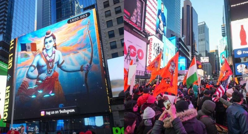 आज राम लला का प्राण प्रतिष्ठा समारोह है। इसकी गूंज सिर्फ भारत में ही नहीं बल्कि विदेशी में भी लार्ज स्केल पर दिखाई दे रही है। USA के न्यू यॉर्क शहर में मौजूद टाइम्स स्क्वायर पर हजारों लोग हाथों में भगवा झंडा लिए ‘जय श्री राम’ के नारे लगा रहे हैं। स्क्वायर पर मौजूद बिग स्क्रीन पर भगवान राम की फोटो भी प्रदर्शित की गई।