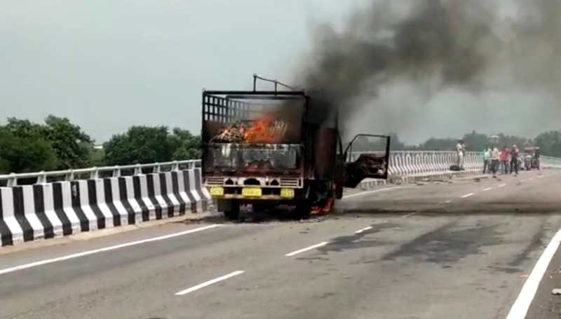 कुछ ही मिनटों में जलकर राख हुई भारी भरकम ट्रक तमाशा देखते रह गए लोग