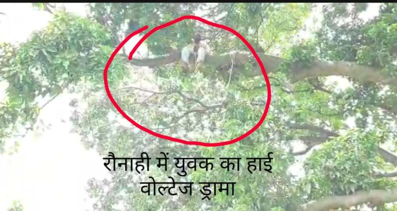 अयोध्या : थाना रौनाही ( Raunahi ) क्षेत्र के मझौड़ा गांव में युवक राम धीरज का हाई वोल्टेज ड्रामा ( High voltage drama ) सामने आया है। रस्सी लेकर युवक पेड़ पर चढ़ गया और आत्महत्या की धमकी देने लगा।आनन-फानन में घबराई उसकी पत्नी ने यूपी हंड्रेड ( UP 100 ) को सूचना दी। मौके पर गांव वाले भी पहुंचे। गांव वालों और ( up police ) पुलिस वालों को युवक ने घंटों छकाया।काफी मान मनौव्वल के बाद युवक पेड़ से नीचे उतरा।