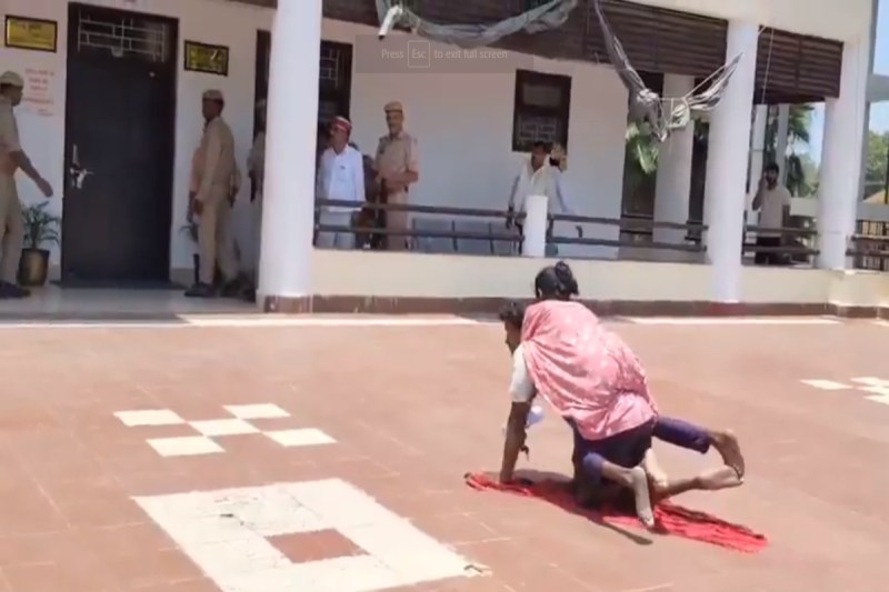 पत्नी को पीठ पर बैठाकर रेंगते-रेंगते DM ऑफिस पहुंचा दिव्यांग। फोटो सोर्स-X