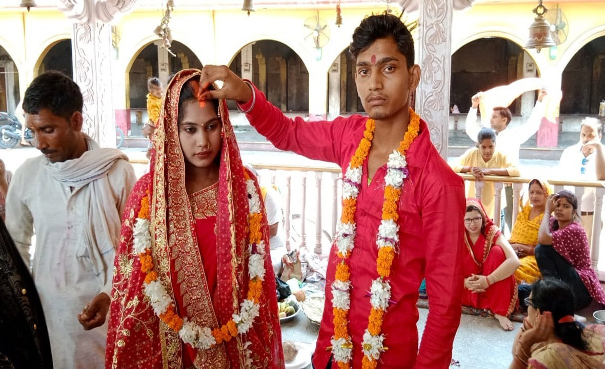 मंदिर में शादी की रश्म पूरी करता प्रेमी युगल