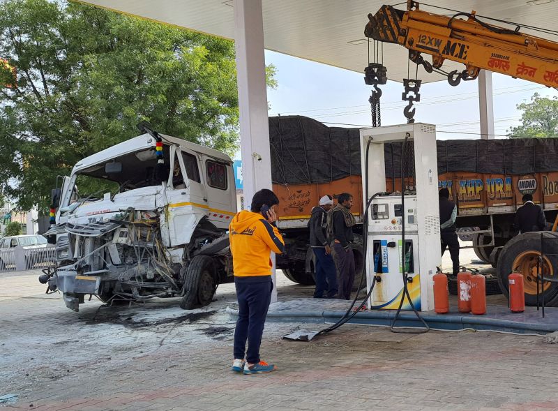 पुलिया से दौड़ता आया ट्रेलर, पेट्रोल पंप पर टकराया, आग लगने से हड़कंप