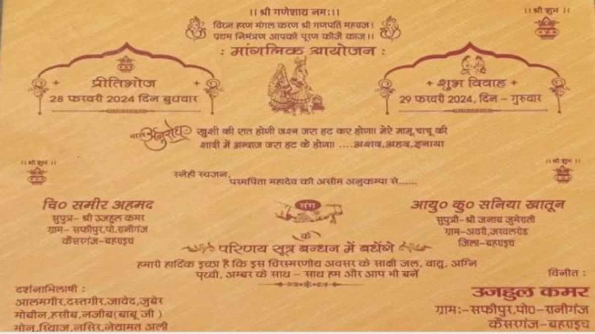 मामला बहराइच के कैसरगंज का है। सफीपुर गांव में रहने वाले अजहुल कमर के बेटे समीर अहमद की शादी 29 फरवरी को होने वाली है। शादी को अभी एक सप्ताह बाकी हैं, लेकिन इस शादी का कार्ड अभी से वायरल हो रहा है। हिंदू रीति रिवाज के मुताबिक छपे इस कार्ड की शुरुआत श्री गणेशाय नमः से हुई है। हिन्दी भाषा में छपे इस कार्ड का समापन विनीत और दर्शनाभिलाषी के साथ किया गया है।