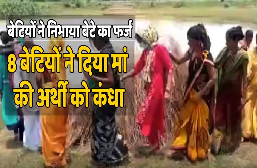 दरअसल कटेदरा गांव की रहने वाली 85 वर्षीय भूरनबाई का निधन हो गया था। भूरनबाई का कोई बेटा नहीं है और पति का भी कुछ समय पहले देहांत हो चुका है। ऐसे में उनकी आठ बेटियों ने ही उनके अंतिम संस्कार की जिम्मेदारी उठाई। मां के निधन के बाद बेटियों ने गांव वालों को बताया कि वो अपनी मां का अंतिम संस्कार करेंगी। गांव वालों ने भी बेटियों के फैसले का स्वागत किया और अंतिम संस्कार में बेटियों की पूरी मदद की। 8 बेटियों ने मां की अर्थी को कंधा दिया और पूरे रीति रिवाज के साथ मुखाग्नि देकर अंतिम विदाई भी दी। जिसने भी बेटियों को मां की अर्थी को कांधा देते हुए देखा उसकी आंखे भर आईं।