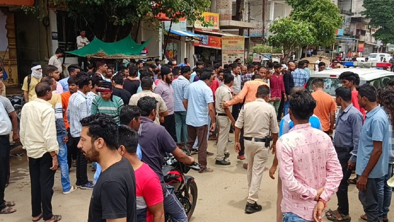 घटना स्थल पर जमा भीड़ व पुलिस।