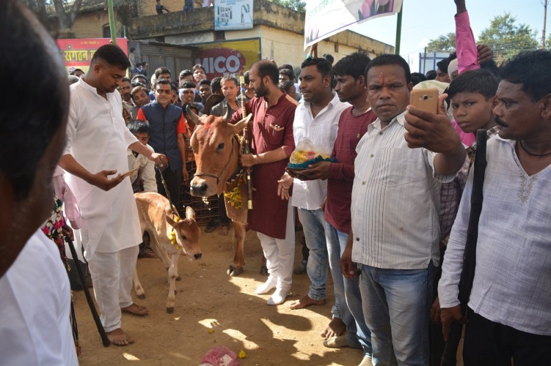 बालाघाट. शहर के सरकारी बस स्टैंड स्थित खिलिया मुठिया मंदिर में शनिवार को जैसे ही गाय खेलने लगी तो सभी सामाजिक बंधुओं मेंं खुशी की लहर दौड़ गई। सभी ने मंदिर प्रागंण मे बनाए गोबर के गोवर्धन से गोबर उठाया और एक-दूसरे को तिलक लगाकर गले मिलकर बंधाईयां दी। आखर मैदान में भारी शोर-गुल और जनसमुदाय के बीच पारम्परिक रुप से गोवर्धन की पूजा-अर्चना कर गाय खिलाई गई। जिसके बाद गोवारा और अहीर समाज के लोगों ने शानदार अहीरी नृत्य प्रस्तुत किया।