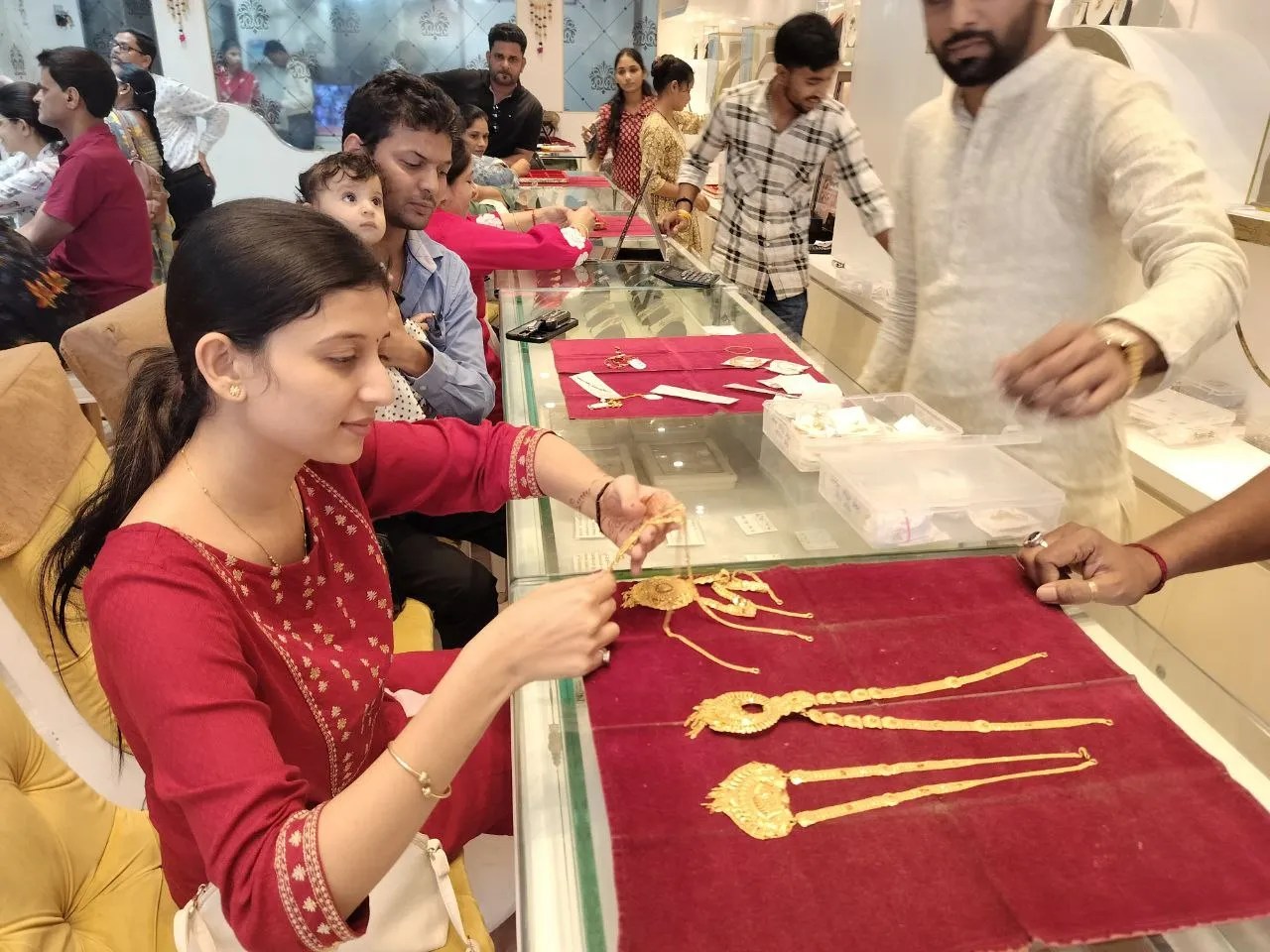 सोनो चाहे एक लाख 34 हजार के पार हो जाए, लेकिन पहले की तरह इस बार भी सोने के जेवरात खरीदी करने वालों की कमी नहीं हुई। चेम्बर ऑफ कामर्स के पदाधिकारियों के अनुसार अकेले शहर मुख्यालय में 70 से अधिक ज्वेलर्स की दुकानें है। सभी दुकानों में दोपहर बाद से ग्राहकों की भीड़ रही। प्रमुख ज्वेलर्स व अन्य दुकानों में ग्राहकों की सुविधानुसार भगवान की मूर्ति सहित कम से लेकर अधिक दाम के आभूषण और डायमंड भी दुकानों में उपलब्ध थे। लोगों ने अपनी आश्यकता अनुसार खरीदी की।