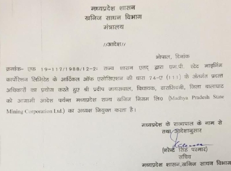 बालाघाट. प्रदेश में कमलनाथ सरकार में खनिज मंत्री रहे वारासिवनी के निर्दलीय विधायक प्रदीप जायसवाल को मौजूदा भाजपा सरकार में मप्र राज्य खनिज निगम लिमिटेड का अध्यक्ष नियुक्त किया है। इस आशय के रविवार को मप्र शासन खनिज साधन विभाग द्वारा आदेश भी जारी कर दिए गए हैं।