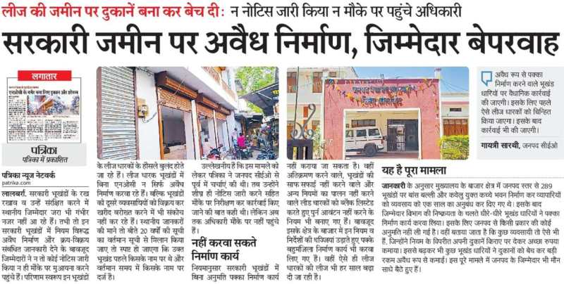 उल्लेखनीय है कि लालबर्रा मुख्यालय के बाजार क्षेत्र में व्यापारियों को एक वर्ष की लीज पर करीब 289 भूखंडों का आवंटन किया गया था। इन सरकारी कच्चे भूखंडों पर वर्तमान में बिना एनओसी बहुमंजिला इमारतें खड़ी कर ली गईं हंै। इस पूरे मामले पर पत्रिका ने अभियान के तहत खबरों का प्रकाशन कर मामले को उठाया। अब जनपद स्तर से जांच समिति का गठन कर कार्रवाई बात कही जा रही है।