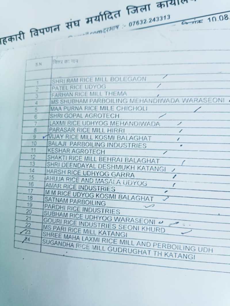 जिला विपणन अधिकारी हीरेंद्र रघुवंशी ने धान का उठाव करने के बावजूद चावल नहीं देने वाले 24 मिलर्स को नोटिस जारी किया है। इन मिलर्स को सात दिनों का समय दिया गया है। समयावधि में चावल जमा नहीं करने पर राइस मिलर्स को ब्लेक लिस्ट करने की कार्रवाई की जाएगी। विभाग से मिली जानकारी के अनुसार श्रीराम राइस मिल बोलेगांव, पटेल राइस उद्योग, फरहान राइस मिल ठेमा, मेसर्स शुभम परबायलिंग मेंहदीवाड़ा वारासिवनी, मां पूर्णा राइस मिल चिचोली, श्री गोपाल एग्रोटेक, लक्ष्मी राइस उद्योग मेंहदीवाड़ा, पाराशर राइस मिल हिर्री, विजय राइस मिल कोसमी बालाघाट, बालाजी परबायलिंग इंडस्ट्रीज, केशर एग्रोटेक, शक्ति राइस मिल बेहरई बालाघाट, श्री दिनदयाल देशमुख कटंगी, हर्ष राइस उद्योग गर्रा, आहुजा राइस एंड मसाला उद्योग, अमर राइस इंडस्ट्रीज, एमएम राइस उद्योग कोसमी बालाघाट, सतनाम परबायलिंग, पारधी राइस इंडस्ट्रीज, शुभम राइस उद्योग वारासिवनी, गौरी राइस इंडस्ट्रीज सिवनीखुर्द, मेसर्स परी राइस मिल कटंगी, श्री महालक्ष्मी राइस मिल एंड परबॉयलिंग उद्योग और सुगंधा राइस मिल गुडरूघाट कटंगी को नोटिस किया गया है।
