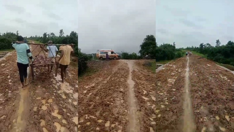 खाट पर प्रसूता,गांव तक नहीं पहुंच पाई एंबुलेंस, दलदल में तब्दील हुई सडक़