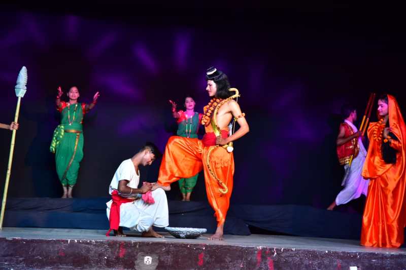 भगवान राम के बाल्यकाल, वाल्मिकि आश्रम, वन भ्रमण और अपने बाल सखा के साथ बिताए बचपन के वे क्षण जिसमें भवगवान श्रीराम के प्राणों की रक्षा बालक निषाद ने हिंसक जीव शेर के साथ लड़ाई कर बचाई थी और दशरथ ने इस क्षण निषाद को अपना पांचवां पुत्र कहा था। भगवान श्रीराम ने वन गमन के अवसर पर अपने ह्नदय से निषाद को गले लगाकर भाई भरत जैसा विशुभित कर दिया। तो वहीं केवट की जि़द पर न झुकने वाले विष्णु भी राम अवतार में केवट के प्रेम के सम्मुख नत् मस्तक हो गए। ये सारे दृश्य जब निकेतन के मंच पर अवलोकित होने लगे तो दर्शक दीर्घा अभिभूत होकर अपलक मंच को निहारते रही। प्रत्येक पात्रों का अभिनय वाक्य संवाद शैली प्रतिकात्मक प्रयोगात्मक शैलियों से युक्त नाट्य लीला अदृश्य वस्तुओं को भी भावनात्मक रूप से दर्शकों को अवलोकित करने का अवसर प्रदान किया।