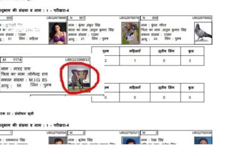 सूची में विवेकानंद कालोनी निवासी एक महिला की फोटो की जगह Sunny Leone की फोटो लगा दी गई है तो वहीं कुंवर अंकुर सिंह की फोटो के बदले हिरन व कुंवर गौरव की फोटो की जगह कबूतर की तस्वीर लगा दी गई है। इतना ही नहीं चंद्रशेखर नगर निवासी व पूर्व मंत्री नारद राय की फोटो की जगह हाथी का फोटो लगाया गया है। इस डाटा की फीडिंग आपरेटर की लॉगिन से की गई है। जिसे तहसीलदार की संस्तुति पर एसडीएम ने अपनी स्वीकृति दे दी थी।