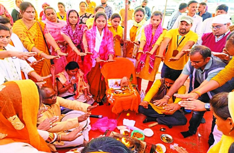 संविदा कर्मचारियों ने धरना स्थल पर किया हवन-पूजन