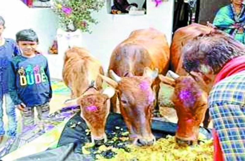 बालोद. मंगलवार को जिले में गोवर्धन पर्व धूमधाम के साथ मनाया गया। ग्रामीण व शहरवासियों ने अपने घरों में पूरी आस्था के साथ गाय के गोबर से गिरिराज गोवर्धन की आकृति बनाकर विधि-विधान से पूजा की। जिनके घर गोधन है, वहां गोधन को स्नान कराकर उनके पैरों से गोबर कुचलाकर गोवर्धन पूजा की गई। घरों में कुम्हड़ा, कोचई की सब्जी व खिचड़ी बनाई गई। इसे मवेशियों को खिलाया गया। इसके बाद फिर सभी ने परिवार सहित खाया। चरवाहा राउत ने गोधन को सोहाई भी बांधी। बाजे-गाजे डांग डोरी के साथ राउत नृत्य करते गोवर्धन पूजा की। सभी को गोबर का टीका लगाकर बधाई दी।