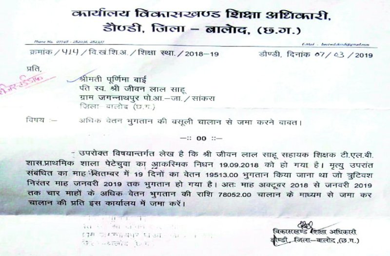 प्राप्त जानकारी के अनुसार डौंडी विकासखंड के ग्राम पेटेचुवा शासकीय प्राथमिक शाला में पदस्थ सहायक शिक्षक टीएलबी जीवन लाल साहू अस्वस्थ रहने के दौरान 19 सितंबर 2018 को बालोद जिले के गृह ग्राम जगन्नाथपुर में निधन हो गया। इसकी नियमत: सूचना पेटेचुवा प्राथमिक शाला के प्राचार्य ने बीइओ कार्यालय डौंडी को दी थी। जहां वेतन भुगतान जोडऩे वाले बाबू ने इस सूचना को अपने रिकार्ड में जोड़ भी लिया। मृत्यु उपरांत मृतक शिक्षक परिवार को केवल 19 दिनों का वेतन भुगतान भी किया जाना था, किन्तु स्व. जीवन लाल को मरणोपरांत भी अक्टूबर 2018 से जनवरी 2019 तक निरंतर वेतन भुगतान किया गया।
