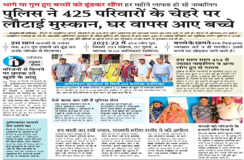 ऑपरेशन मुस्कान के तहत सालभर में पुलिस ने 60 बच्चों को ढूंढने में सफलता हासिल की है। जिसमें चार बच्चे है व 54 बालिकाएं शामिल हैं। पुलिस इसे बड़ी उपलब्धि मान रही और आगे भी इसी तत्परता से काम करने की बात कह रही है।