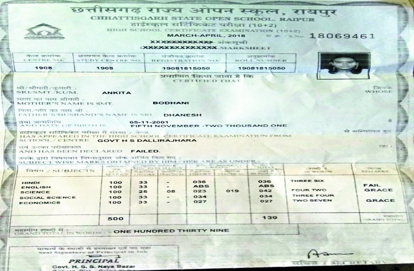 अंकिता ने बताया कि परीक्षा के बाद छत्तीसगढ़ राज्य ओपन स्कूल रायपुर के परिणाम में परीक्षा संबंधित अनुक्रमांक 19081815050 वाले परीक्षा परिणाम में संस्कृत विषय व उसकेे प्राप्तांक ही अंकित नहीं है, बल्कि उसकी जगह अंग्रेजी विषय में अनुपस्थित दर्शा कर फेल लिख दिया गया है।