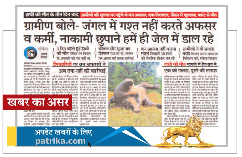 पत्रिका ने जिम्मेदारों की लापरवाही की थी उजागर, हाथी की करंट से मौत मामले में रेंजर को हटाया