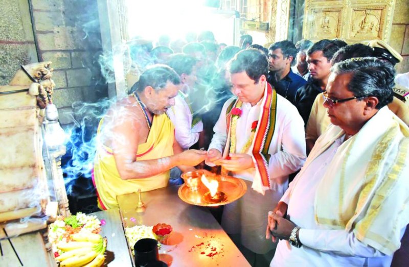 चामुंडेश्वरी मंदिर में की पूजा... राहुल ने पुराने मैसूरु क्षेत्र के दौरे की शुरुआत मैसूरु के चामुंडेश्वरी मंदिर में पूजा-अर्चना के साथ की। इस दौरान उनके साथ मुख्यमंत्री सिद्धरामय्या, प्रदेश प्रभारी महासचिव के सी वेणुगोपाल, प्रदेश अध्यक्ष जी परमेश्वर भी थे। दो दिन के विश्राम के बाद राहुल जन आशीर्वाद यात्रा के चौथे चरण में शनिवार सुबह ही मैसूरु पहुंचे थे। राहुल ने पिछले सप्ताह तटवर्ती इलाके का दो दिवसीय दौरा किया था। इस दौरान राहुल चिकमगलूरु जिले के श्रृंगेरी मठ भी गए थे। इस बार दो दिवसीय दौरे के दौरान राहुल पुराने मैसूरु क्षेत्र के मैसूरु, मण्ड्या और चामराजनगर का दौरा करेंगे। पहले दिन राहुल ने मण्ड्या और चामराजनगर जिले का दौरा किया। रविवार को राहुल दौरा समाप्त करने से पहले मैसूरू के महाराजा मैदान में जनसभा को संबोधित।