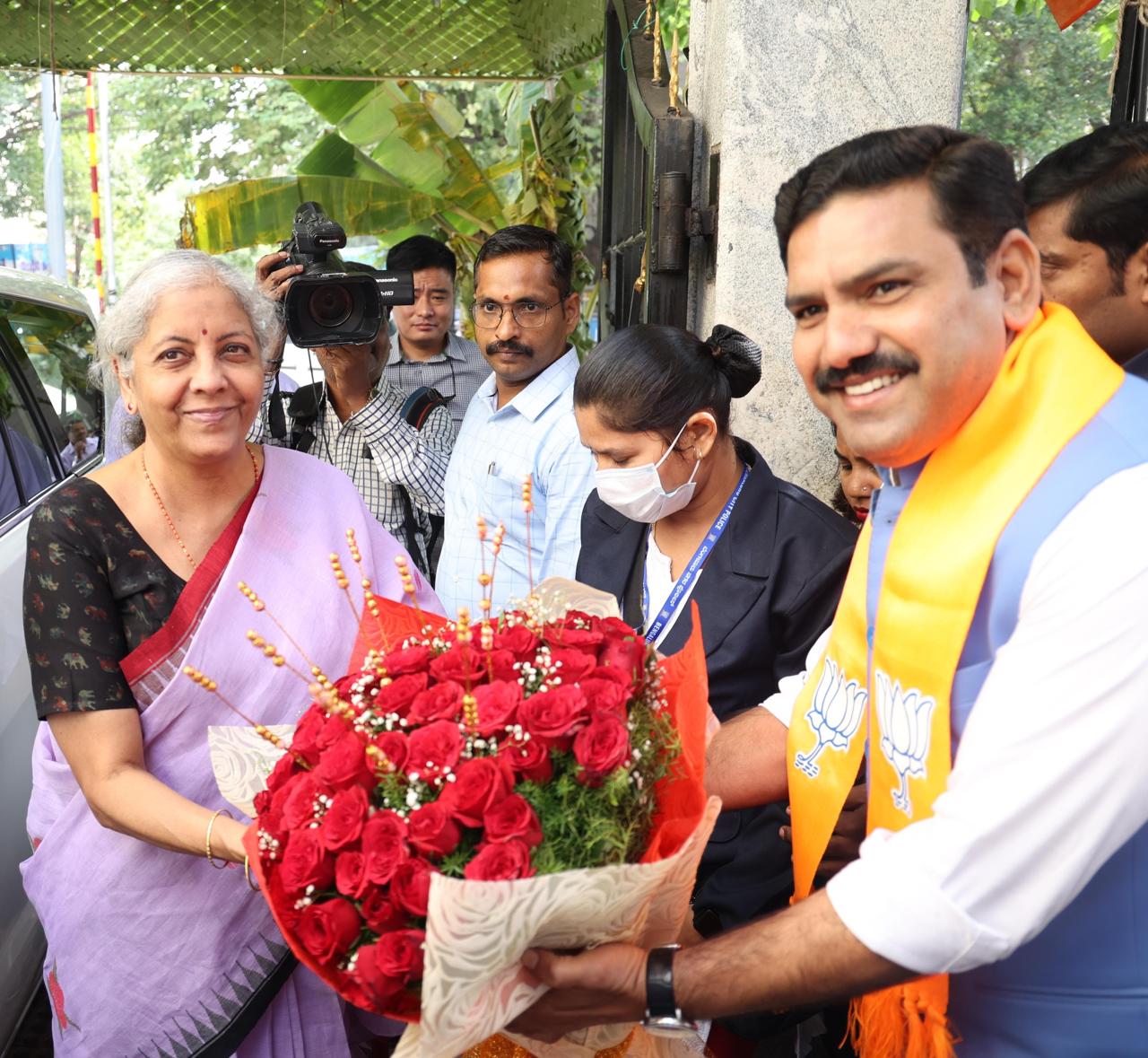 केंद्रीय मंत्री निर्मला सीतारमण का स्वागत करते भाजपा प्रदेश अध्यक्ष विजयेंद्र।
