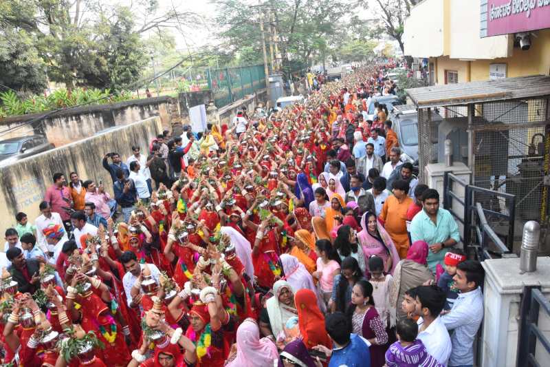 बेंगलूरु. लाल साड़ी व चुंदड़ी में सजी महिलाएं, सिर पर कलश और श्रीयादे माता, गंगामाई के गूंजते जयकारे, मंगल वाद्यों पर थिरकते लोग। यह नजारा था शुक्रवार को प्रजापति समाज, कर्नाटक ट्रस्ट, बेंगलूरु, कॉटनपेट की ओर से आयोजित श्रीयादे माता मंदिर के 12वें वार्षिकोत्सव का।वार्षिकोत्सव के प्रथम दिन तुलसी तोटा से निकाली गई विशाल कलशयात्रा में जहां राजस्थानी संस्कृति के चोखे रंग की छटा बिखरी वहीं माहौल में श्रद्धा और भक्ति का अनूठा रंग भी घुला नजर आया।