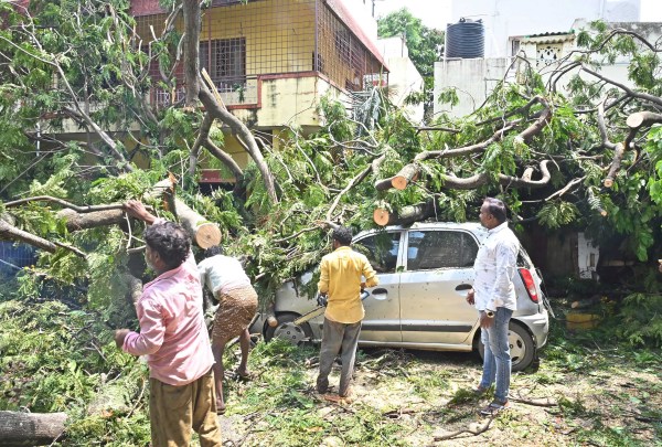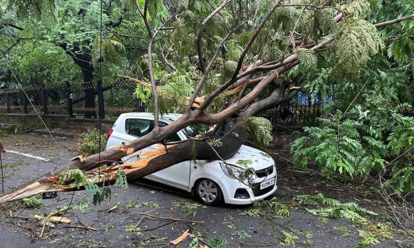 विजयनगर में तेज बरसात के दौरान पेड़ गिरने से क्षतिग्रस्त हुई कार।