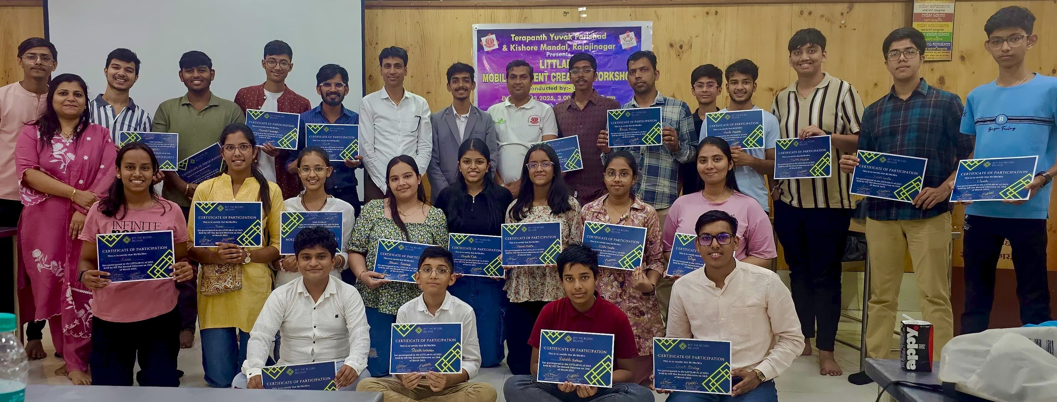 तेरापंथ किशोर मंडल, राजाजीनगर की ओर से ओटीआर-ओब्लिवियन के सहयोग से तेरापंथ सभा भवन में आयोजित लिटलैब मोबाइल कंटेंट क्रिएशन कार्यशाला में मंडल के सदस्य व ट्रेनर आर्यन गोलेच्छा ने प्रतिभागियों को मोबाइल से वीडियो एडिटिंग, कंटेंट तैयार करने आदि के गुर सिखाए। इसके अलावा फोटो के एंगल, कैमरे को सेट करने और विभिन्न प्रकार के टूल्स को उपयोग करने के तरीके सिखाए। सभी ग्रुप को प्रोडक्शन टीम के हिसाब से डायरेक्टर, एडिटर, स्क्रिप्ट राइटर आदि रोल देकर वीडियो प्रोड्यूस करने का टेस्ट दिया गया, जिसमें तीन ग्रुप ने प्रथम, द्वितीय एवं तृतीय स्थान प्राप्त किया। सभी प्रतिभागियों को सर्टिफिकेट प्रदान किए गए।