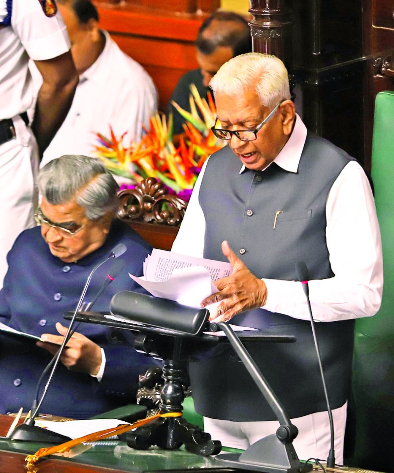 बेंगलूरु. प्रधानमंत्री नरेंद्र मोदी के सिद्धरामय्या के नेतृत्व वाली राज्य की कांग्रेस सरकार पर भ्रष्टाचार और गिरती कानून-व्यवस्था की स्थिति को लेकर निशाना साधने के एक दिन बाद ही राज्यपाल वजूभाई वाळा ने सोमवार को विधानमंडल के संयुक्त अधिवेशन को संबोधित करते हुए कानून-व्यवस्था बनाए रखने और भ्रष्टाचार से लडऩे के लिए राज्य सरकार की सराहना की। परंपराओं के मुताबिक विधानमंडल के साल के पहले अधिवेशन की शुरुआत राज्यपाल के अभिभाषण से होती है। मौजूदा विधानसभा का यह आखिरी अधिवेशन है और सरकार ने अभिभाषण के जरिए अपनी उपलब्धियां गिनाने के साथ ही विपक्ष के आरोपों को भी खारिज करने की कोशिश की।