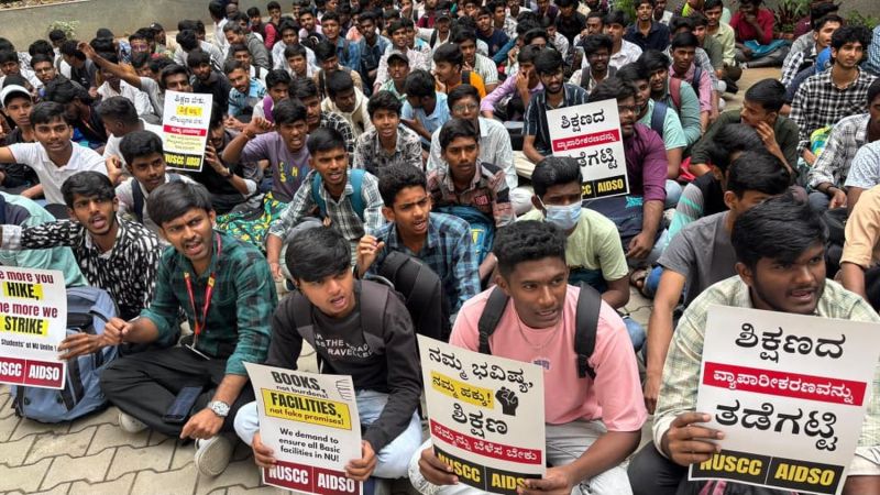 अखिल भारतीय लोकतांत्रिक छात्र संगठन (एआइडीएसओ) और नृपतुंग विश्वविद्यालय (एनयू) छात्र संघर्ष समिति के बैनर तले सोमवार को सैकड़ों छात्रों के विरोध प्रदर्शन के बाद एनयू प्रशासन ने बढ़ी हुई पाठ्यक्रम शुल्क वापस ले ली।