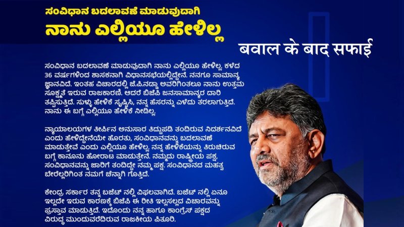 शिवकुमार ने सोमवार को सदाशिवनगर में अपने आवास के बाहर मीडिया के सामने स्पष्ट किया, मैंने कभी नहीं कहा कि संविधान में बदलाव किया जाना चाहिए। भाजपा मेरे बयानों को तोड़-मरोड़ कर पेश कर रही है। संविधान की रक्षा करना हमारी पार्टी का मौलिक अधिकार है।