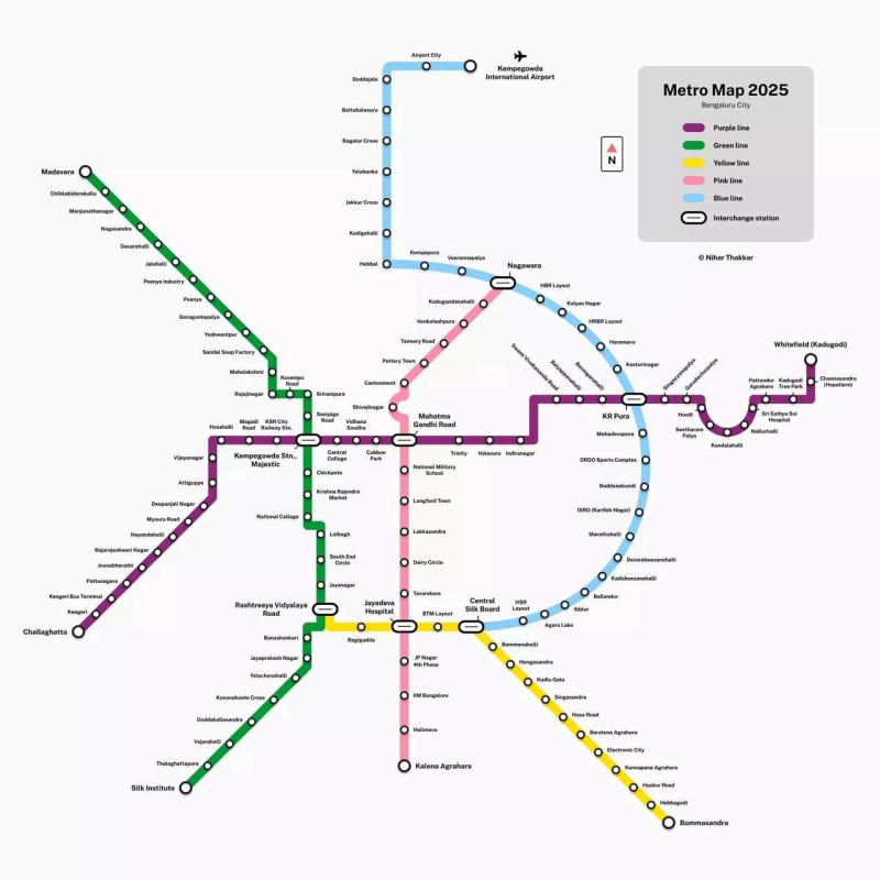 बेंगलूरु. नम्मा मेट्रो की केम्पेगौड़ा अंतरराष्ट्रीय हवाई अड्डा (केआईए) तक सीधी कनेक्टिविटी नहीं के कारण यात्रियों को बीएमटीसी बस पर ही निर्भर रहना पड़ेगा। कारण की सेन्टर सिल्क बोर्ड के अलावा किसी भी मेट्रो से केम्पेगौड़ा अंतरराष्ट्रीय हवाई अड्डा की सीधी कनेक्टिविटी नहीं होगी। खासकर ग्रीन लाइन मेट्रो का उपयोग करने वाले यात्रियों को तो केम्पेगौड़ा अंतरराष्ट्रीय हवाई अड्डा पहुंचने के लिए तीन से चार मेट्रो बदलनी पड़ेगी। वहीं पर्पल लाइन से हवाई अड्डे जाने वाले यात्रियों को दो से तीन मेट्रो बदलनी पड़ेगी। यदि कोई व्यक्तिसेंट्रल सिल्क बोर्ड से मेट्रो में चढ़ता है, तो उसे हवाई अड्डा तक पहुंचने के लिए 29 स्टेशनों से होकर यात्रा करनी होगी। हेब्बाल से हवाई अड्डा तक पहुंचने के लिए ही 9 स्टेशन हैं।